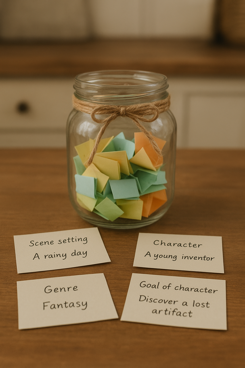It’s basically just a container of some sort filled with pieces of paper – each bearing a story element such as a character, setting, object, goal, theme, genre…. it could be anything you wish.